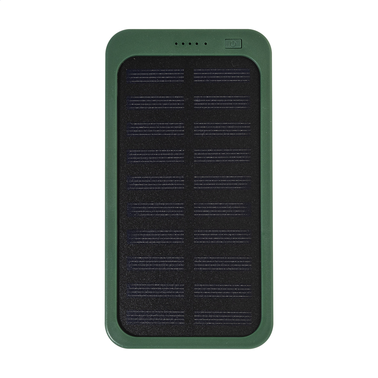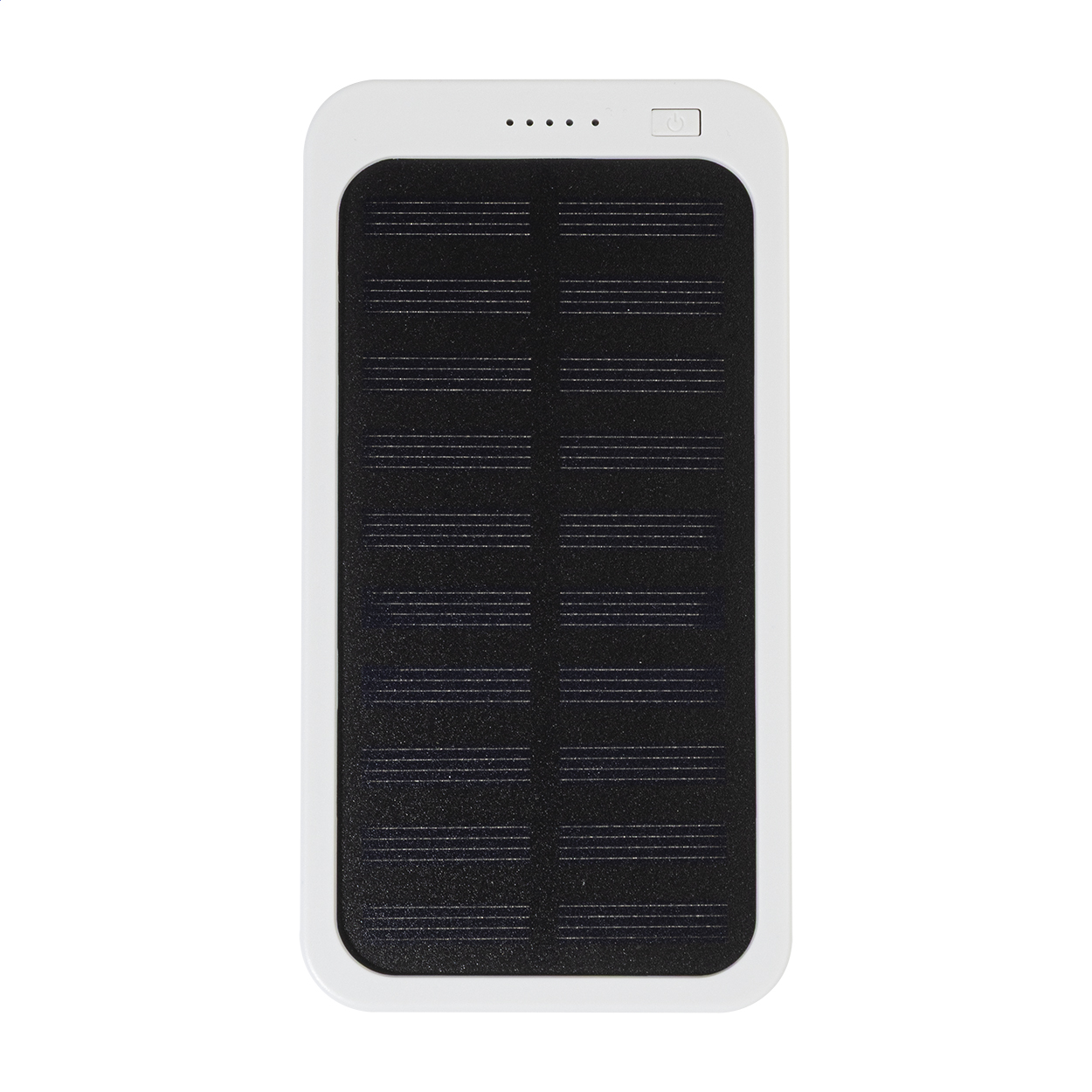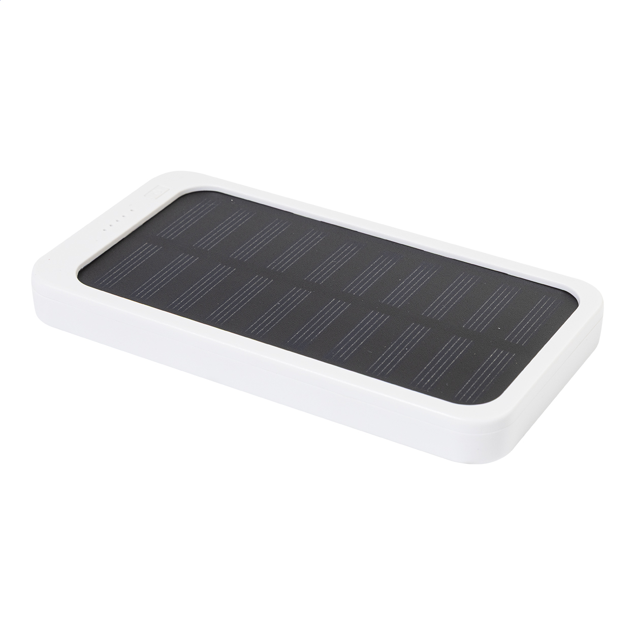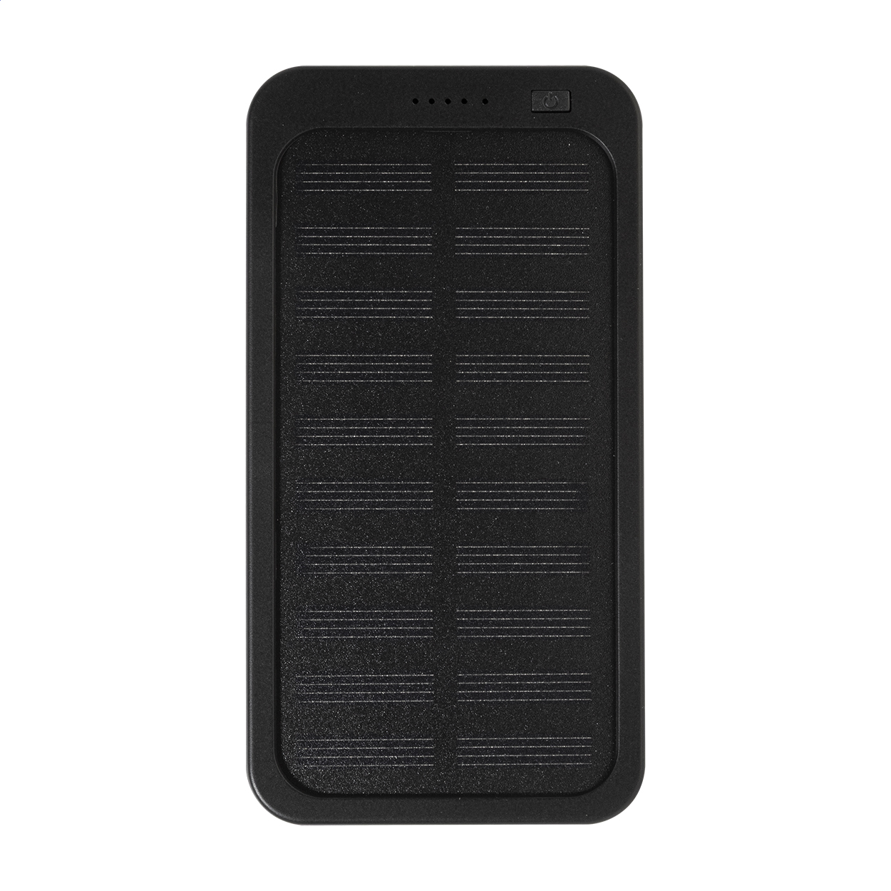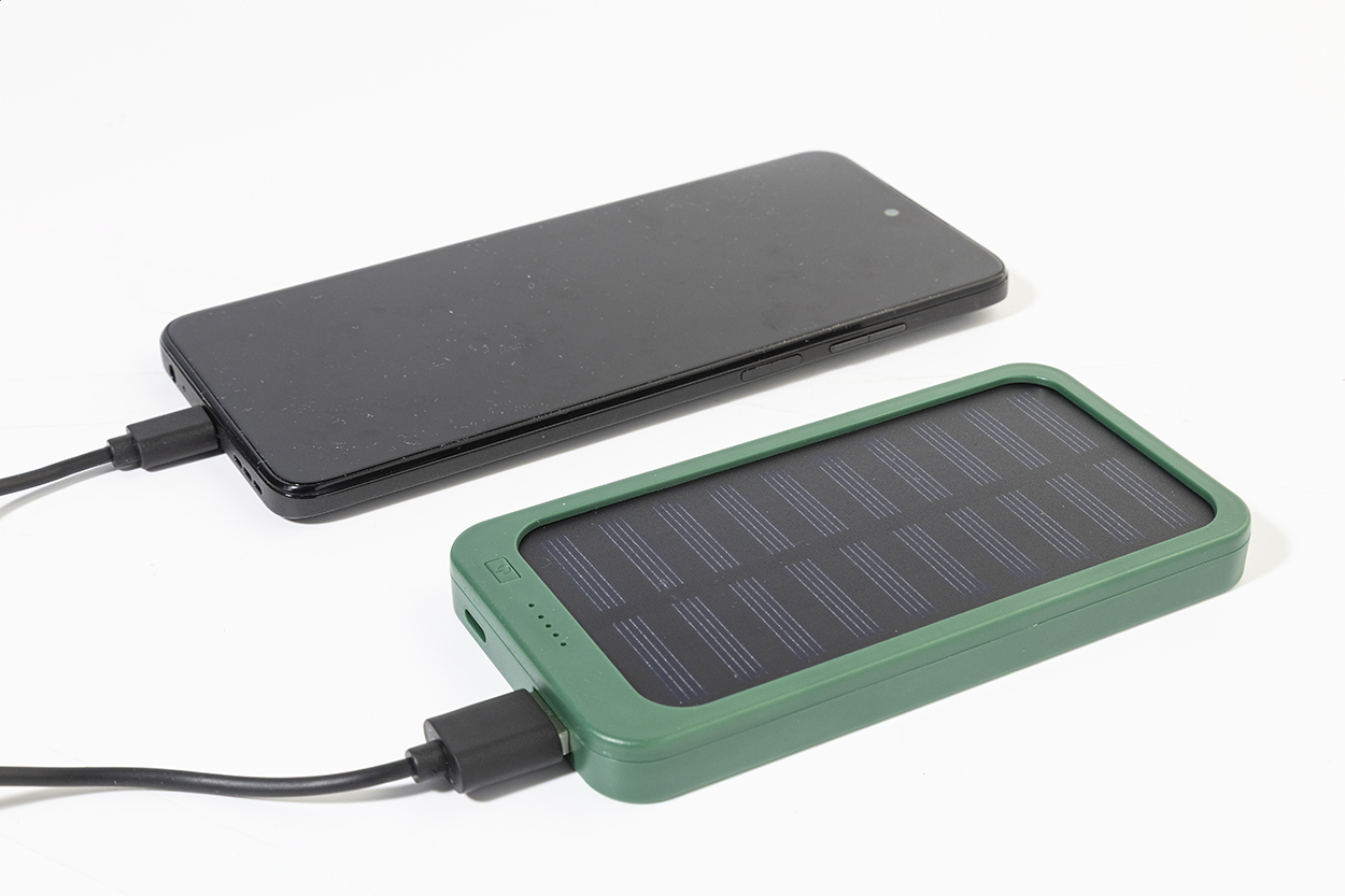 Recycled ABS power bank with built-in solar charger and 4000 mAh battery. With 1 USB and 1 USB-C charger ports. USB-C input port. Including USB charger cable.