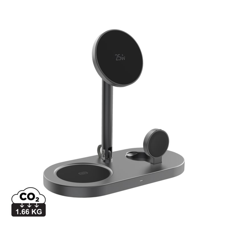 Stolni 3-u-1 magnetni bežični punjač snage 25 W omogućuje istovremeno punjenje pametnog telefona, Apple Watcha ili Samsung Watcha te bežičnih slušalica. Učinkovit sustav osigurava stabilno i brzo punjenje uz naprednu zaštitu od pregrijavanja i sigurnosne mehanizme za svakodnevnu upotrebu. Izrađen je od RCS certificiranog recikliranog ABS-a, aluminija i PC-a s ukupno 47 % recikliranog sadržaja. Moderan dizajn i održivi materijali čine ga idealnim promotivnim tehnološkim proizvodom i premium poslovnim poklonom.