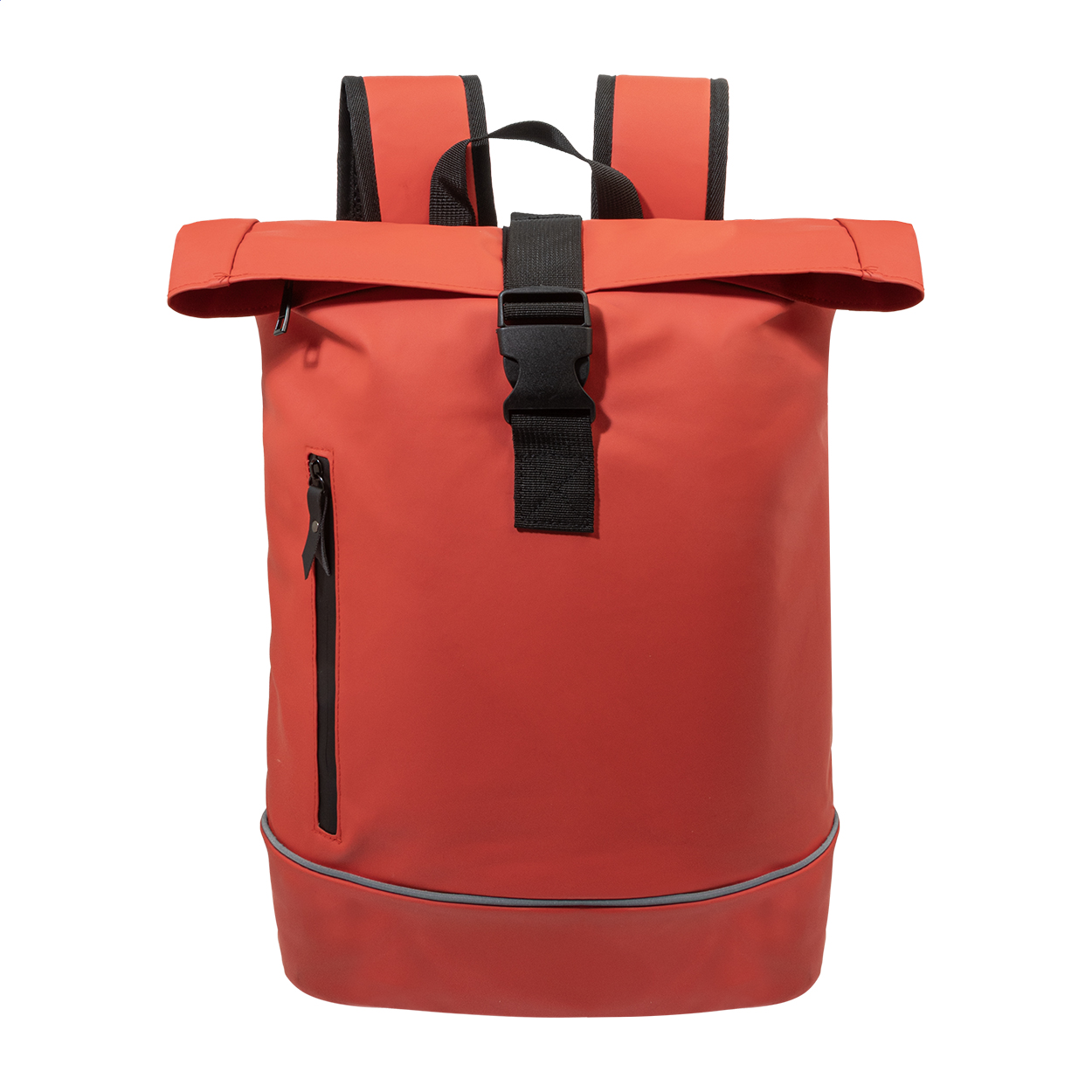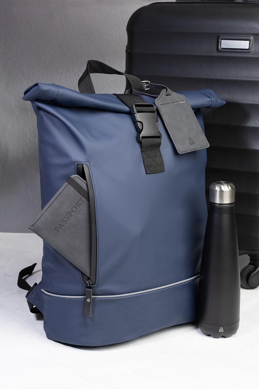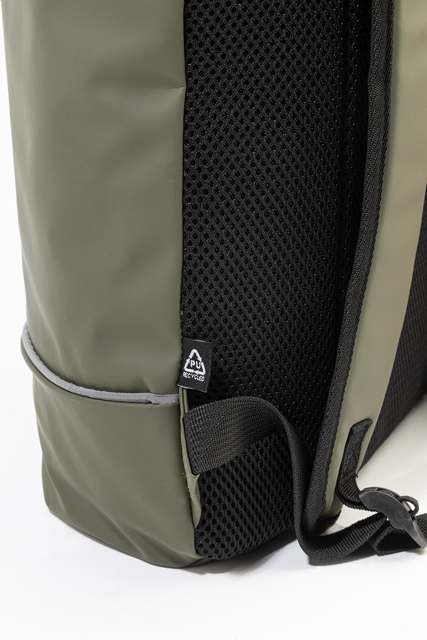 Vodootporni roll-top ruksak od mekane reciklirane PU kože s glavnim pretincem na patentni zatvarač i kopču, prednjim džepom s vodootpornim patentnim zatvaračem, podstavljenim pretincem za prijenosno računalo (15") i reflektirajućom trakom. Ima podstavljena leđa i naramenice. S prepoznatljivom etiketom od recikliranog PU materijala.