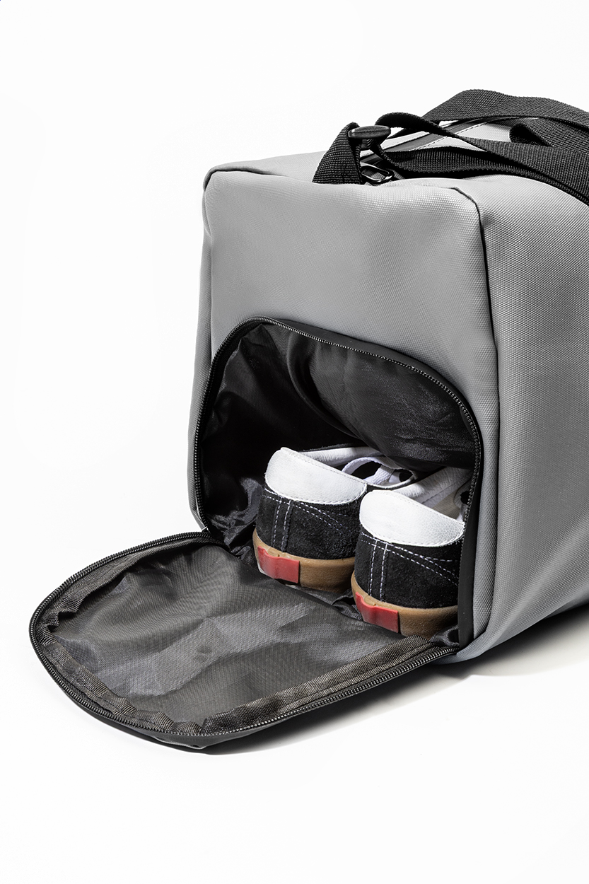 Vodootporna sportska torba od RPET materijala s glavnim pretincem na patentni zatvarač, prednjim džepom na patentni zatvarač, odvojenim pretincem za obuću i podesivom naramenicom. Izrađena od 600D RPET poliestera s PU premazom, s prepoznatljivom RPET etiketom.