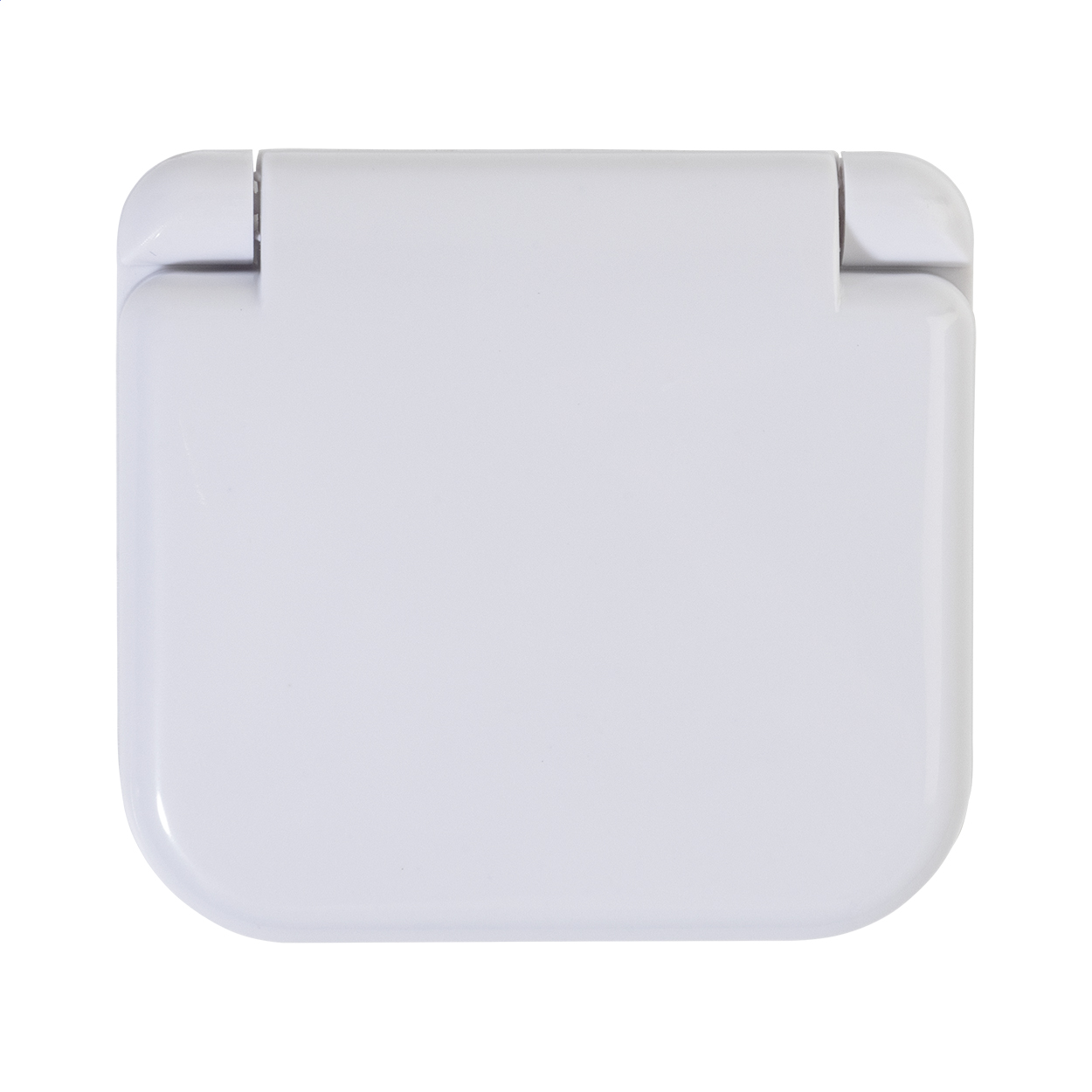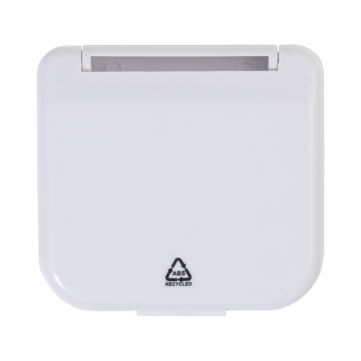 Comprehensive travel sewing kit in recycled ABS case. Including 6 coloured polyester threads, 3 needles, 3 headed pins, a safety pin, 2 buttons, 2 snap fasteners, a needle threader, tweezers and scissors.