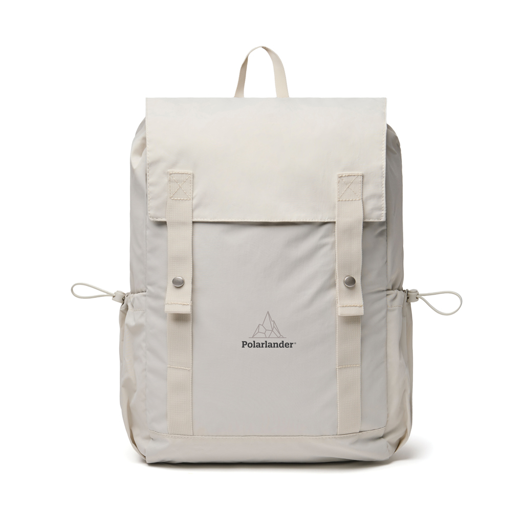 The KENTO Everyday Backpack is designed to carry everything you need throughout the day- it offers plenty of room for daily essentials and is ideal for day trips and travel, folding compactly when needed. Crafted from RCS-certified recycled nylon with a PU backing and finished with an RCS-certified recycled polyester 300T lining, it contains 43% certified recycled material — offering a responsible and durable solution.The design features a front flap secured with two webbing straps and magnetic button closures. Under the flap, a front zipper pocket and a spacious main compartment with dual-side drawstring closure provide easy access and secure storage. Inside, there is room for a 15.6” laptop sleeve to keep your device protected and organised.A top webbing handle and adjustable back shoulder straps ensure comfortable carrying, while side bottle holders with drawstring closure add extra practicality.