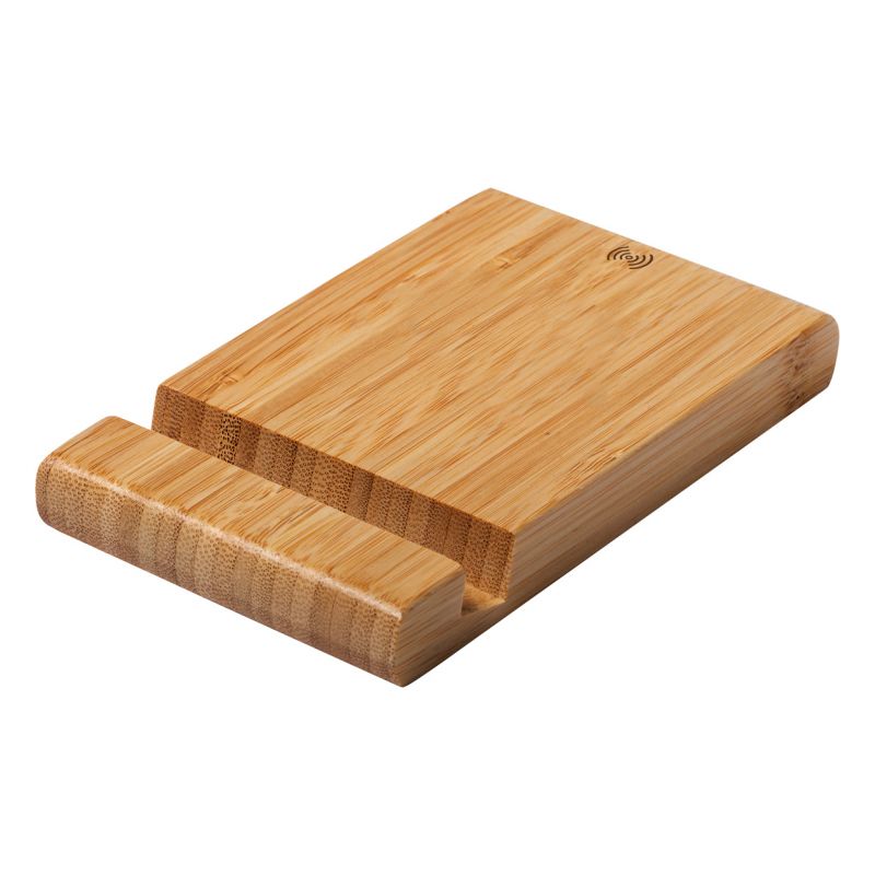 Bamboo desk mobile holder with built-in wireless charger (15W). Including USB charger cable.