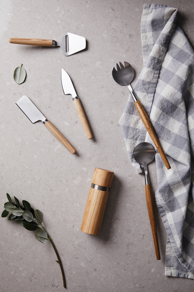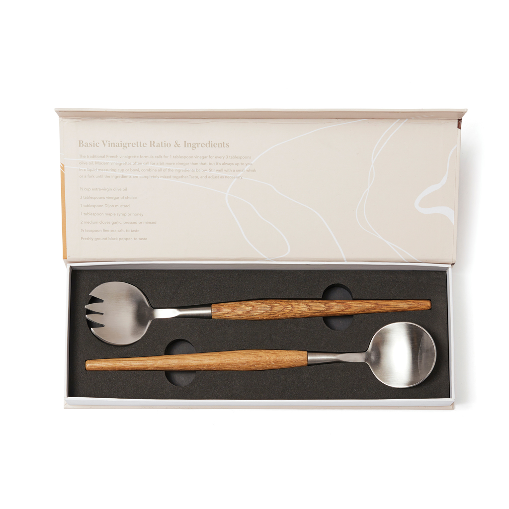 Čelični pribor za posluživanje s hrastovim ručkama. Klasičan i minimalistički dizajn u čistom skandinavskom stilu. Posuđe je savršeno za večere i posebne obroke kod kuće. Pakiran u ekskluzivnoj poklon kutiji.